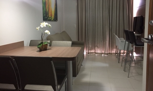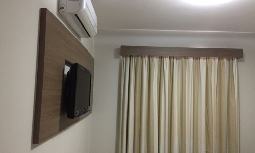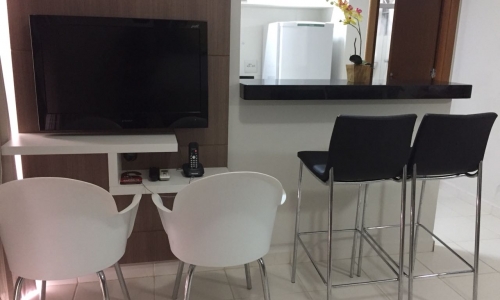 Quarto suíte com cama de casal com bicama, tv 32” LCD e ar condicionado. Sala com sofá cama de casal, banheiro social e outra tv 32” LCD. Cozinha conjugada com fogão no estilo cook top, geladeira e micro-ondas.
